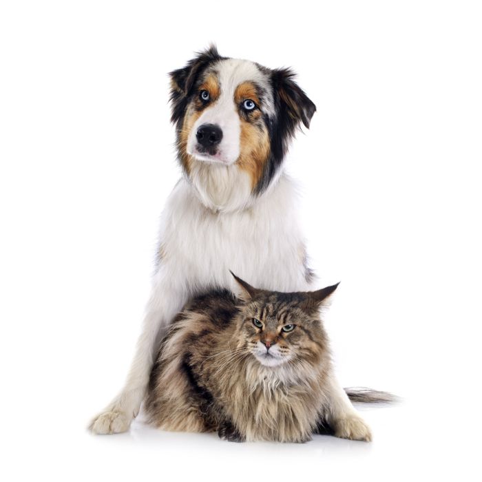 dog and cat in front of white background