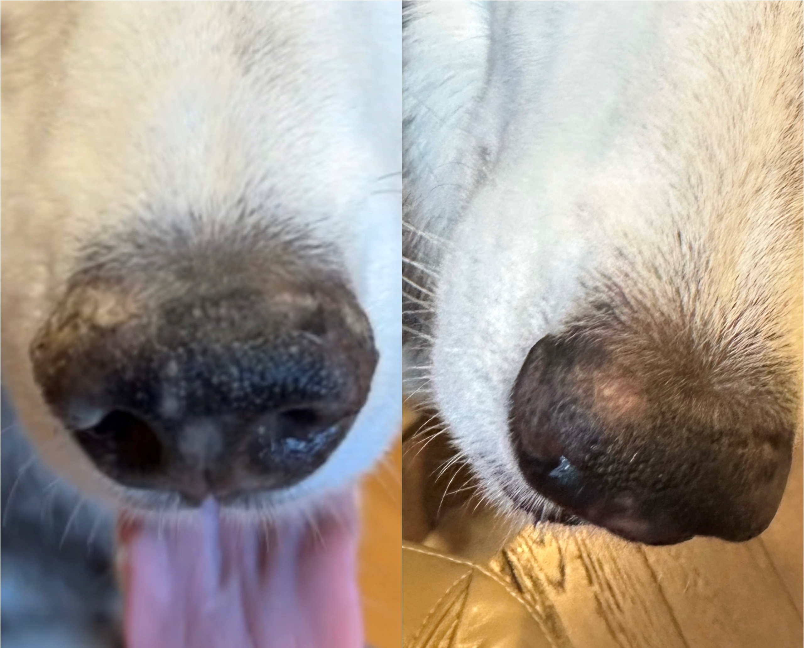 - Dry, cracked nose leather: Common in brachycephalic breeds like Bulldogs, Pugs, and Boxers, but it happens across all breeds especially in winter